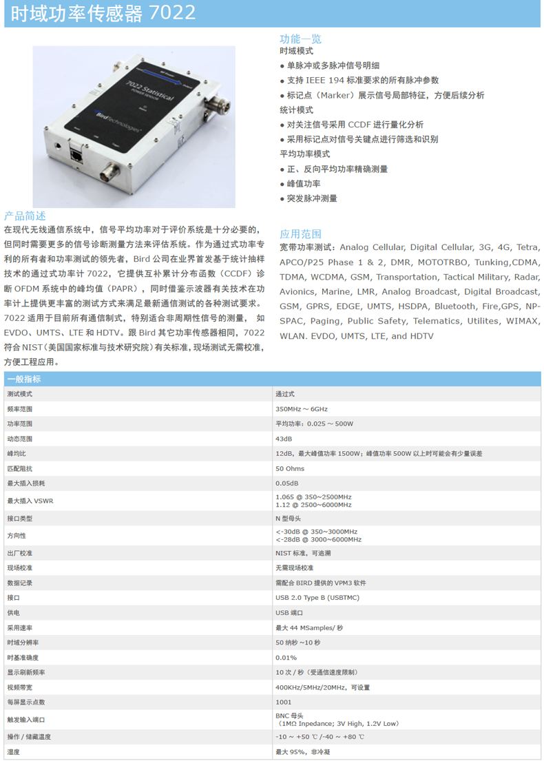 Bird鳥牌7022時(shí)域功率傳感器6GHz/500W通過式射頻功率測試